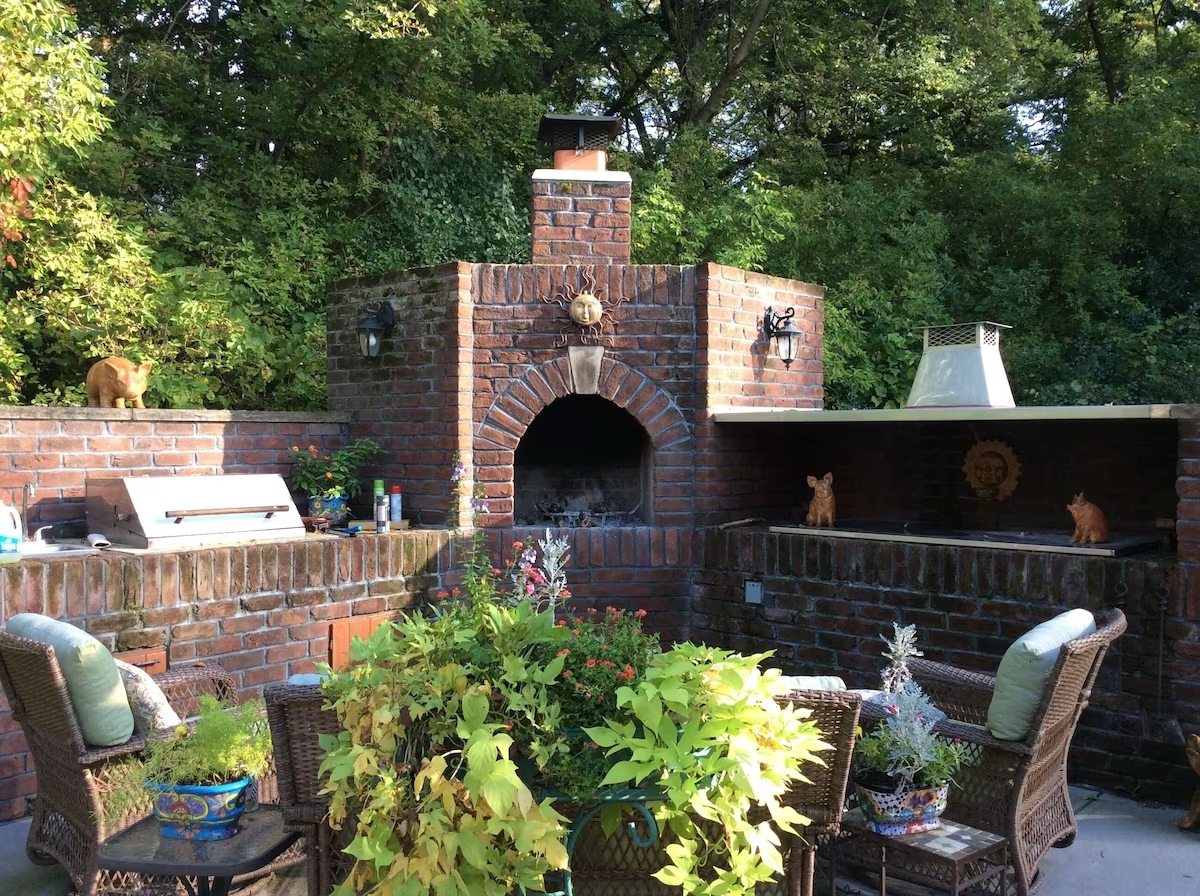 Enjoy a secluded concrete patio with over 500 square feet of usable space, with a custom built-in fire place, stainless steel charcoal grill, and pig roaster with a stainless steel spit. The patio has an island with granite counter-top with 8 high back chairs and a built-in refrigerator. The total seating areas on the patio will accommodate up to 20 people.